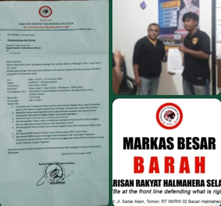 Hal tersebut sebagaimana disampaikan oleh Ketua Barah Adi Hi. Adam kepada media ini usai menyampaikan permohonan izin aksi kepada Polres Halsel, Senin (12/01/2026).