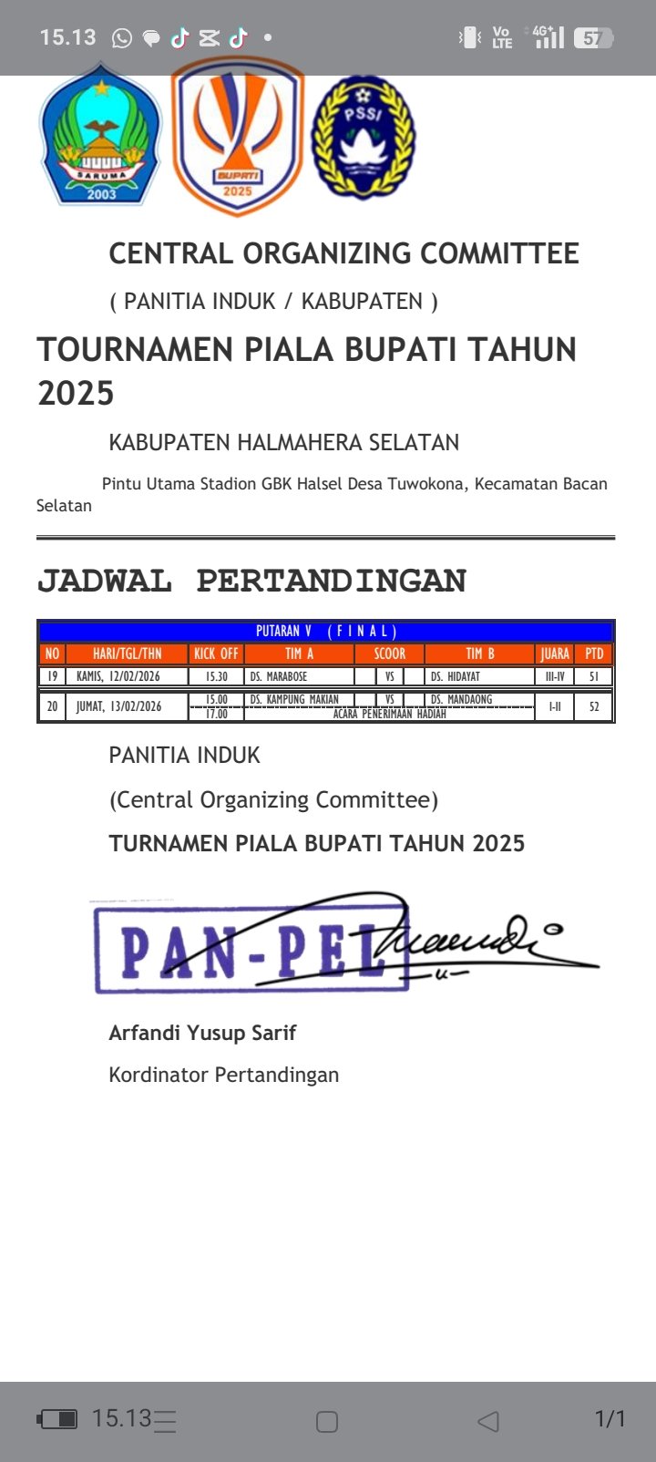 WaidobaNusantaraori.com | Halsel – Putaran V (final) sepak bola Piala Bupati Halmahera Selatan (Halsel) Provinsi Maluku Utara tahun 2025 Siap dilaksanakan oleh panitia.
